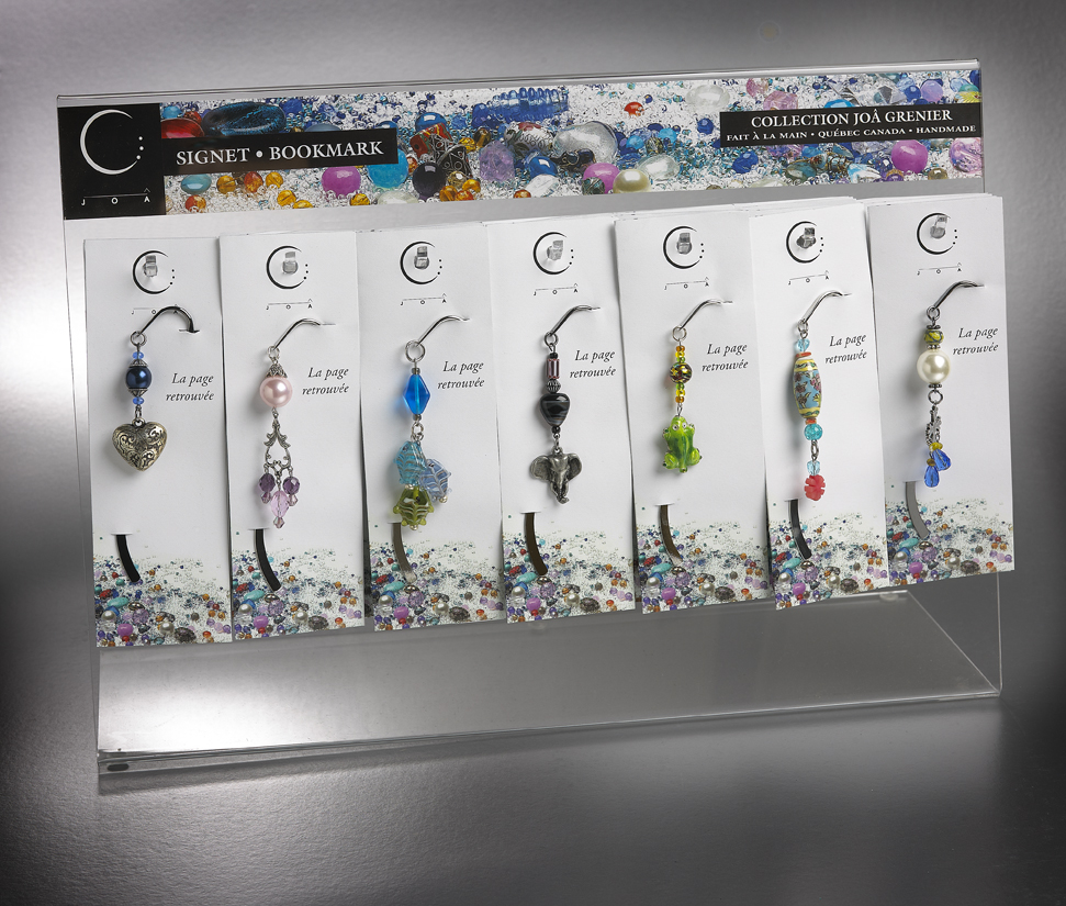 Je peux vous fournir les présentoirs et chaque produit est accompagné d'une carte signature.